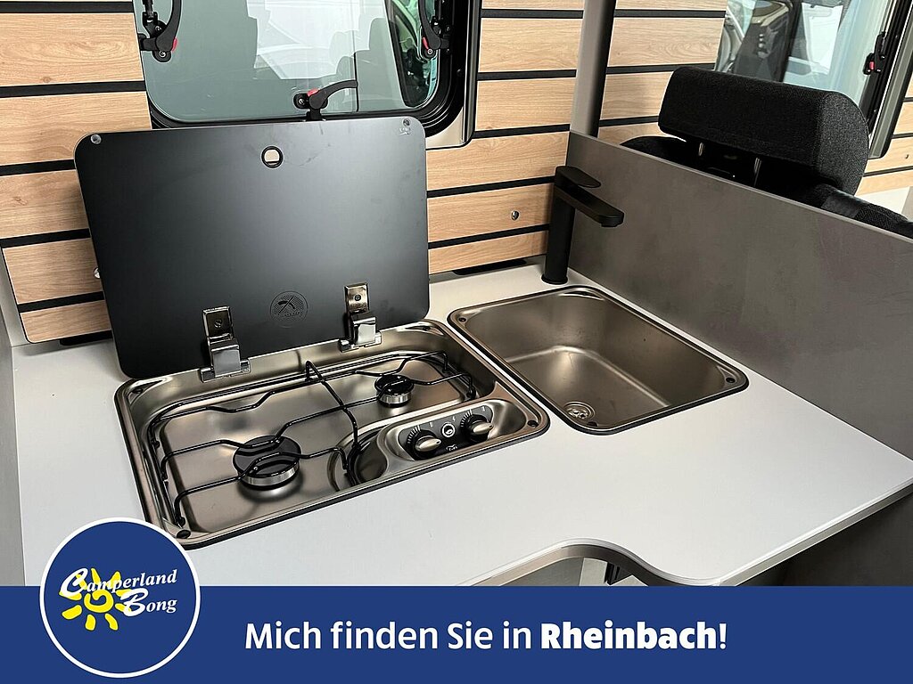 - Gourmet-Küche: 2-Flamm-Kocher, großzügige Schublade mit Besteckeinsatz, Türen mit flexiblen Fachböden und großzügiger Arbeitsfläche sowie Halterung für Abfalleimer (erhältlich über Custom Parts)