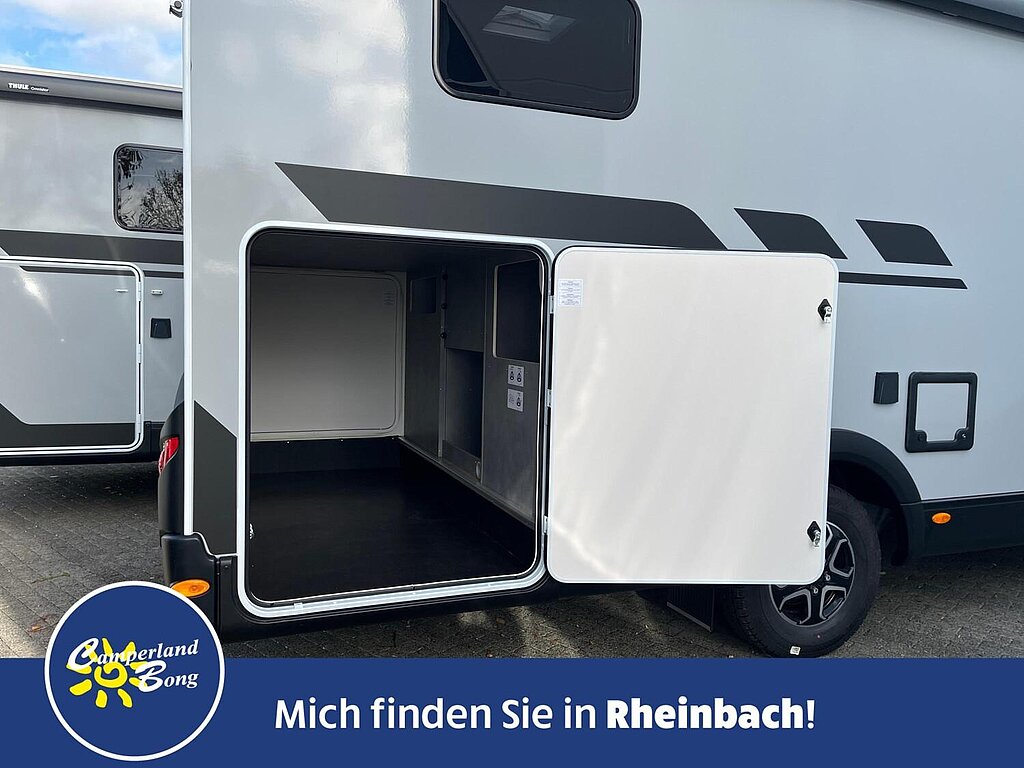 - Große Heckgarage: zwei Garagentüren/-klappen mit Dreh-/Spannverschluss, Heckabsenkung (150 kg Flächenlast), Anti-Rutsch-Oberfläche, beheizt, Zurrleisten, beleuchtet, 1 x 230 V Steckdose