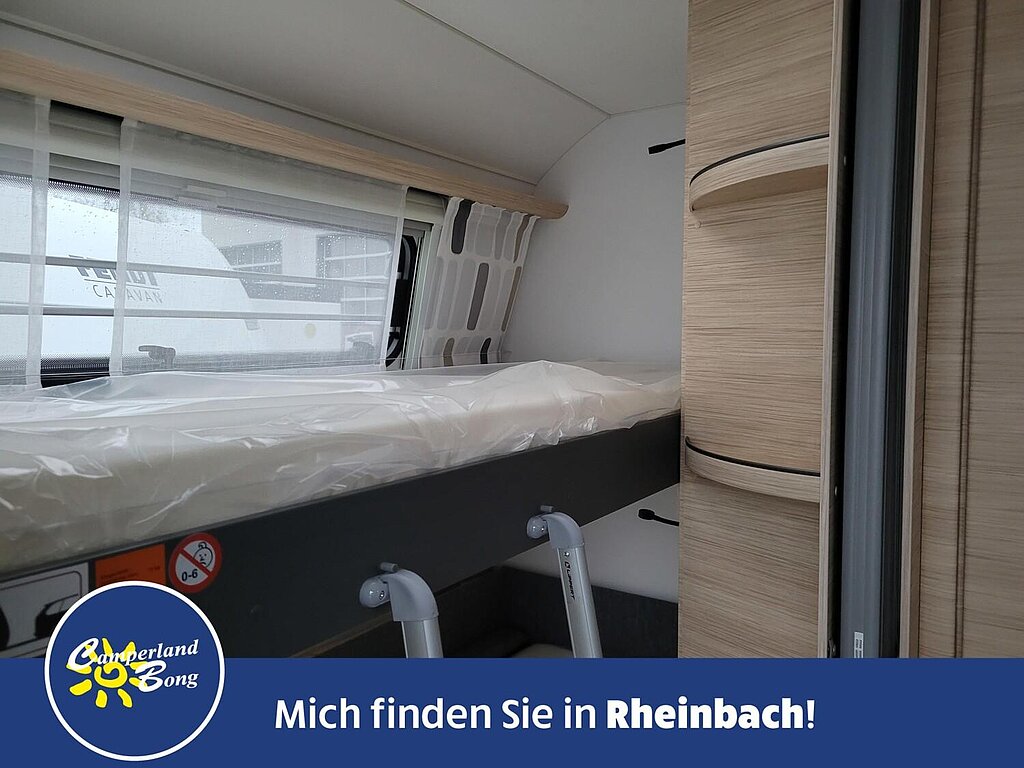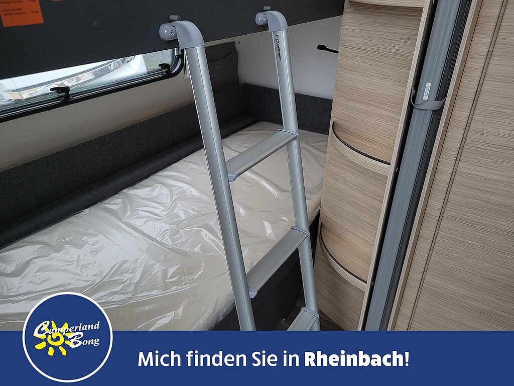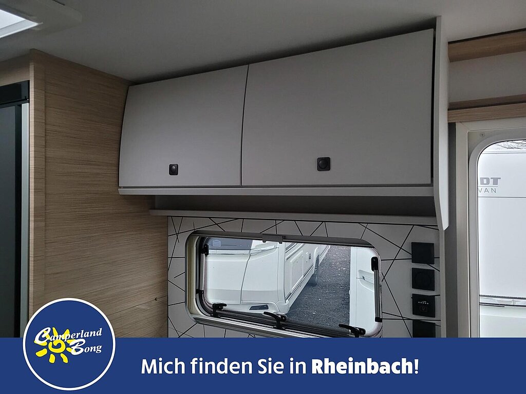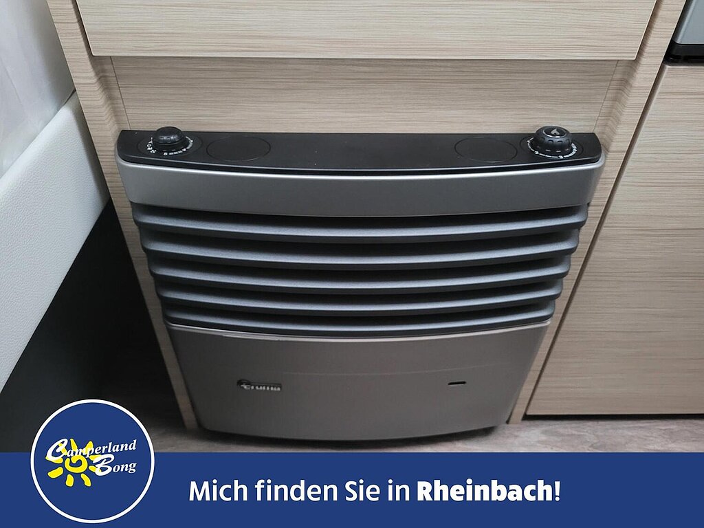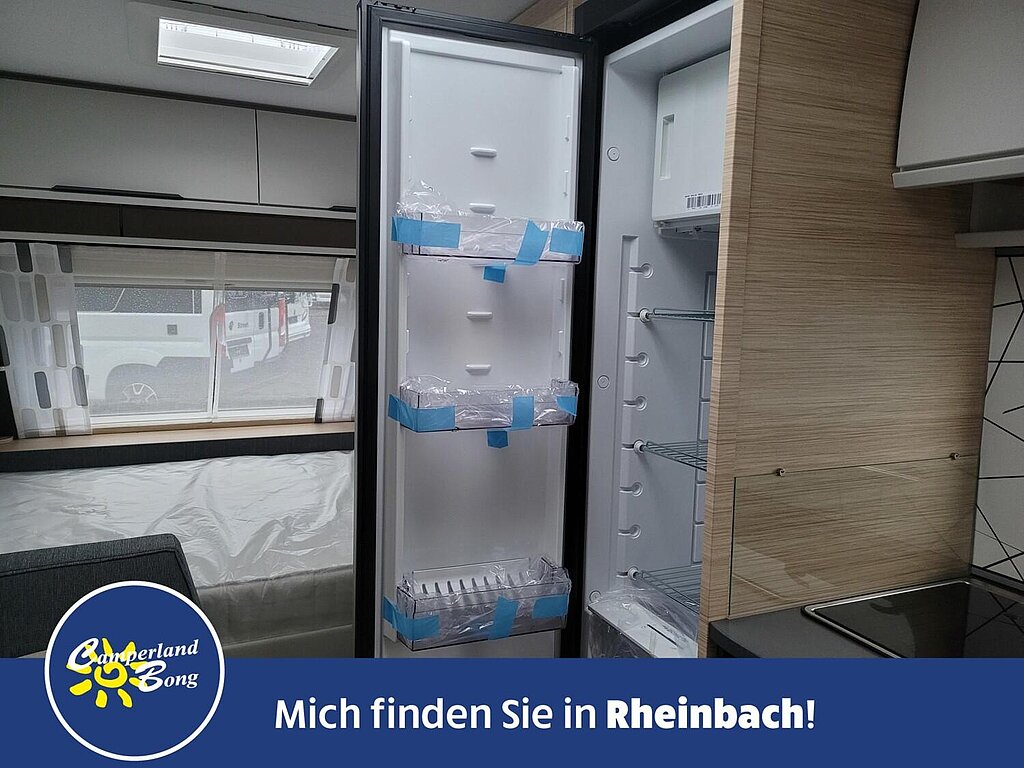 - Eingangstür mit integriertem und isoliertem Einstieg, Abfallsammler und Ablage, im oberen Eingangstürbereich getöntes Fenster und Verdunkelungsplissee