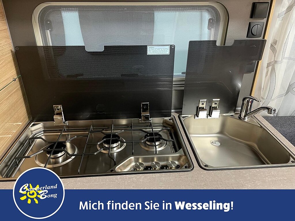- Kocher (3-flammig) mit Zündsicherung, Zündautomatik, matt emailliertem Kocherrost, Glasabdeckung und separater Spüle mit Glasabdeckung
