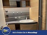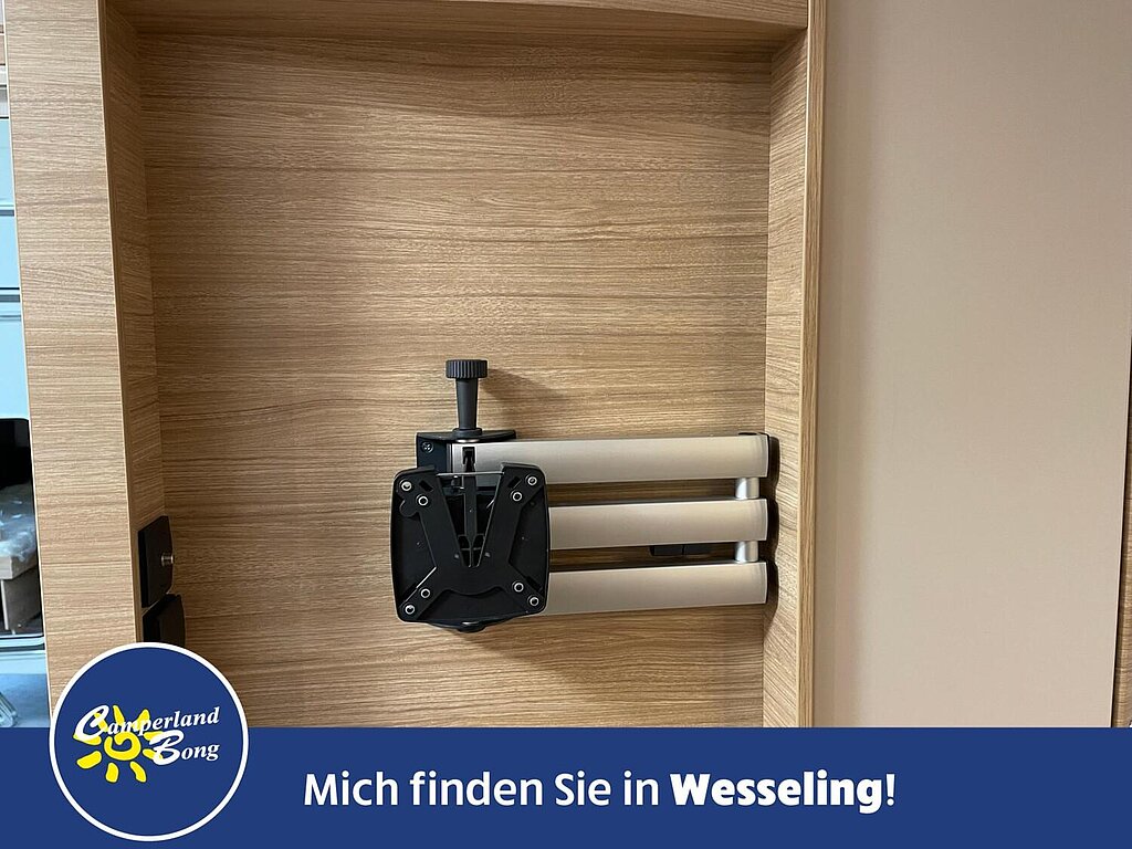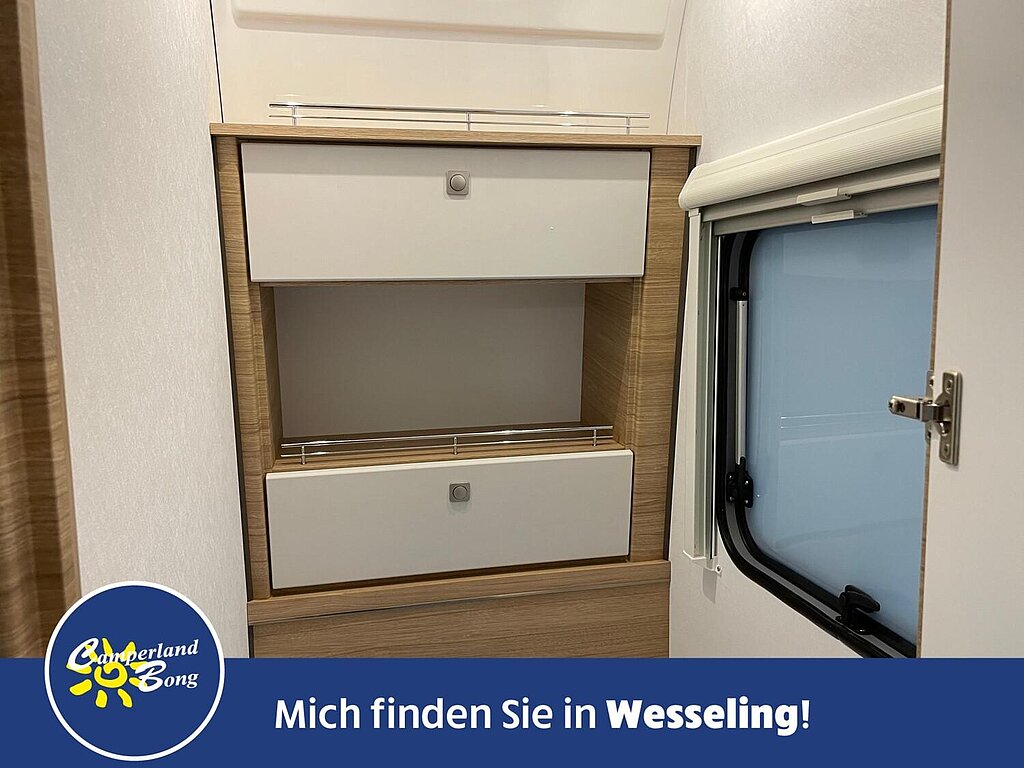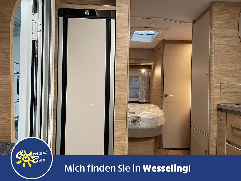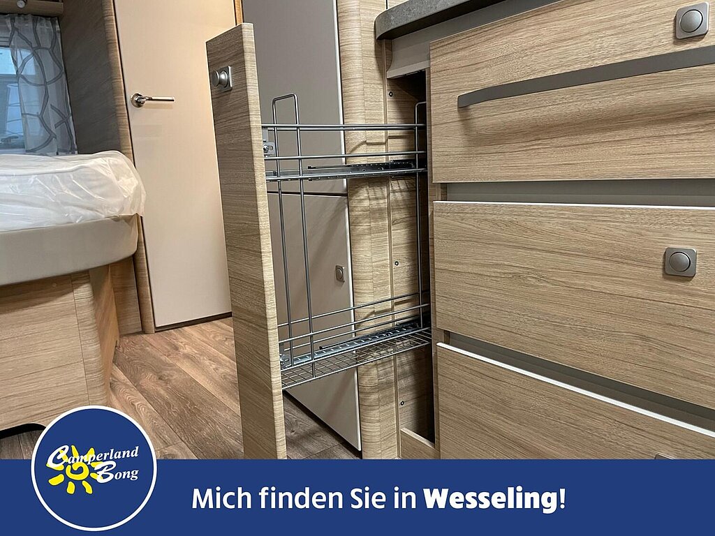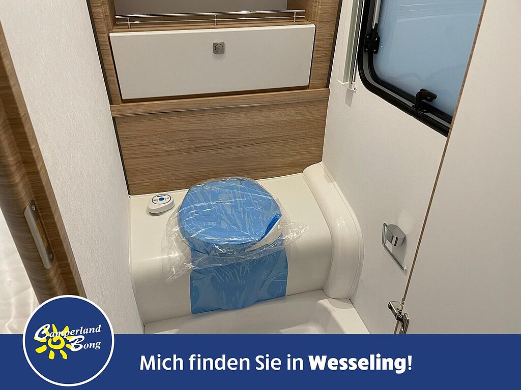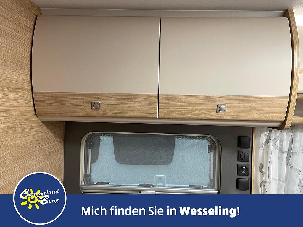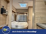 - Eingangstür mit integriertem und isoliertem Einstieg, Abfallsammler und Ablage, im oberen Eingangstürbereich getöntes Fenster und Verdunkelungsplissee
