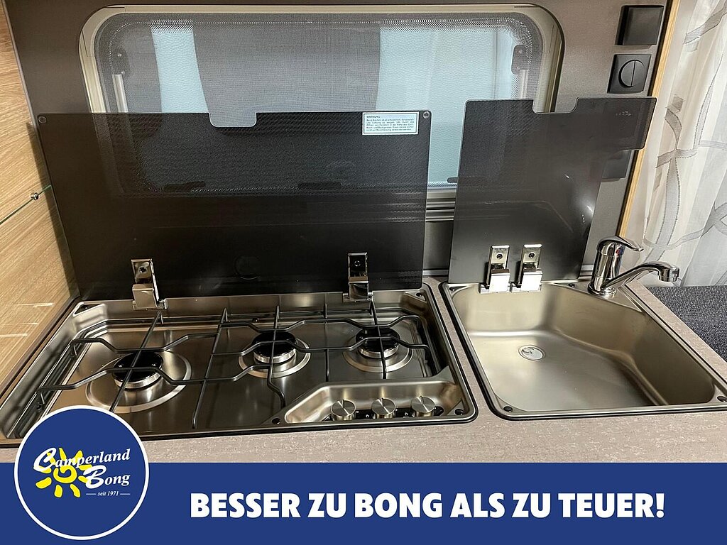 - Kocher (3-flammig) mit Zündsicherung, Zündautomatik, matt emailliertem Kocherrost, Glasabdeckung und separater Spüle mit Glasabdeckung