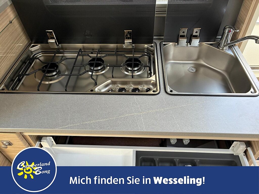 - Kocher (3-flammig) mit Zündsicherung, Zündautomatik, matt emailliertem Kocherrost, Glasabdeckung und separater Spüle mit Glasabdeckung
