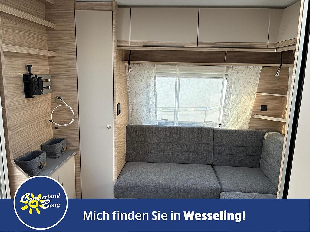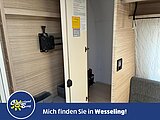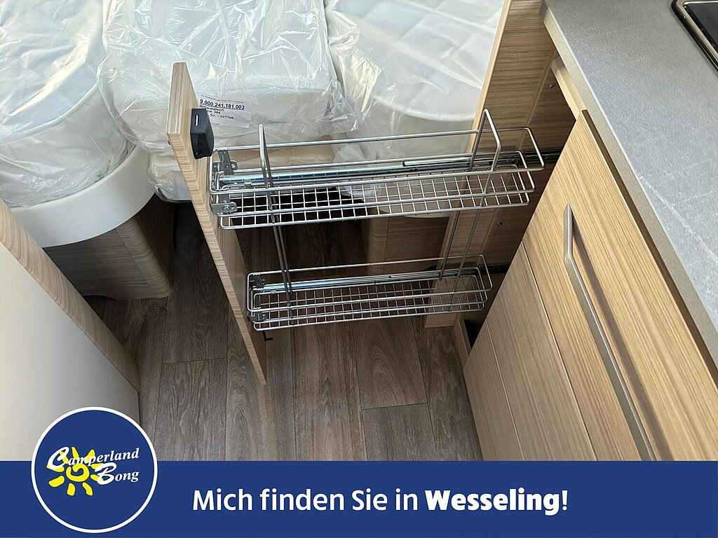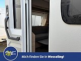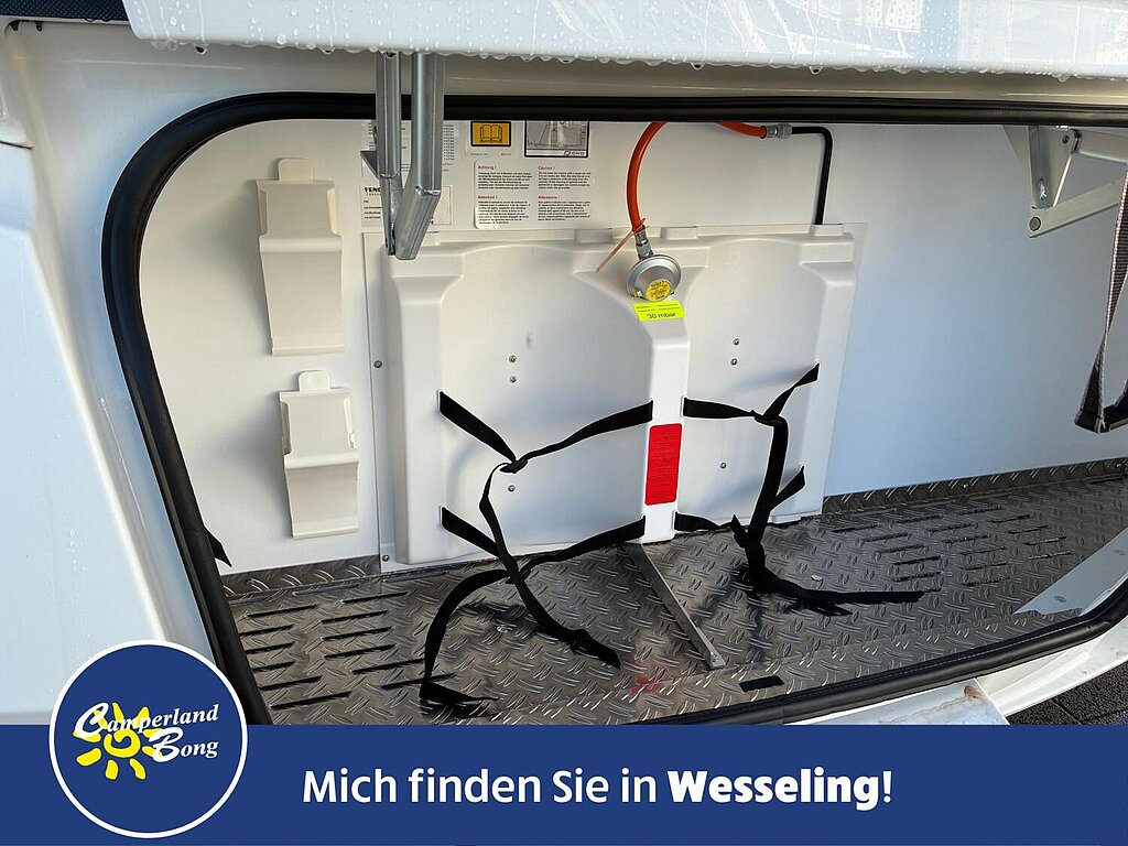 - Eingangstür mit integriertem und isoliertem Einstieg, Abfallsammler und Ablage, im oberen Eingangstürbereich getöntes Fenster und Verdunkelungsplissee