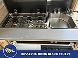 - Kocher (3-flammig) mit Zündsicherung, Zündautomatik, matt emailliertem Kocherrost, Glasabdeckung und separater Spüle mit Glasabdeckung