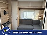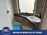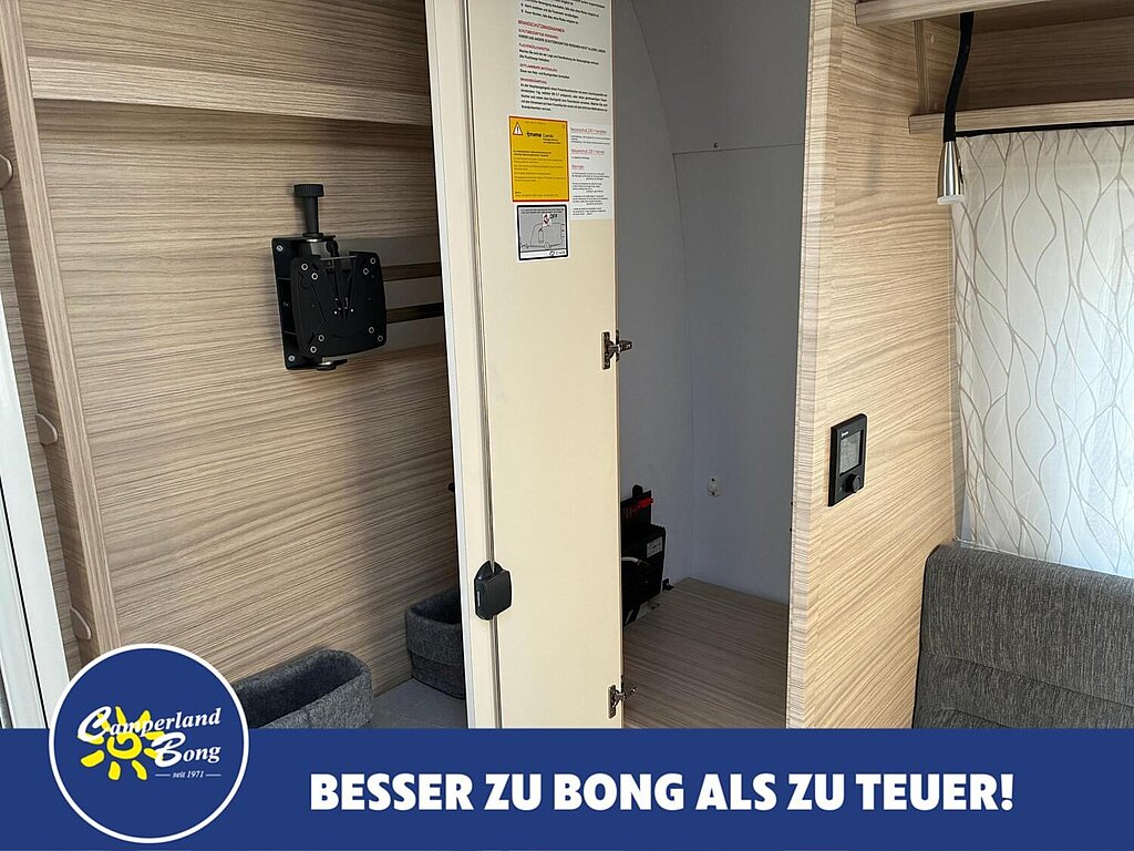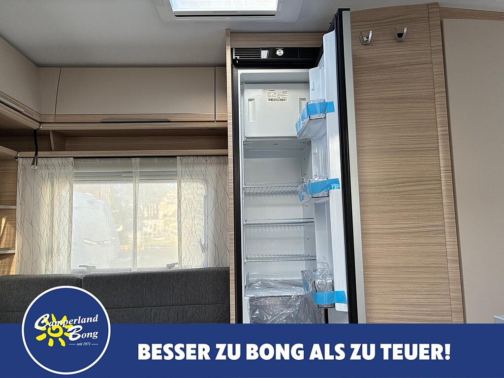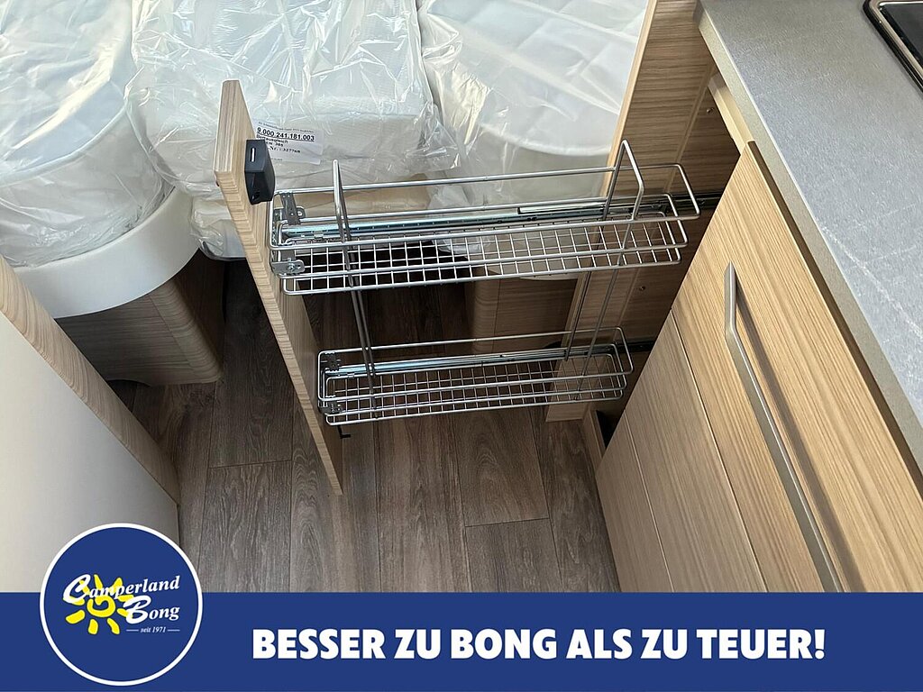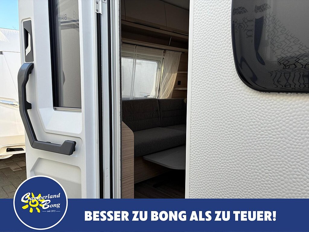 - Eingangstür mit integriertem und isoliertem Einstieg, Abfallsammler und Ablage, im oberen Eingangstürbereich getöntes Fenster und Verdunkelungsplissee