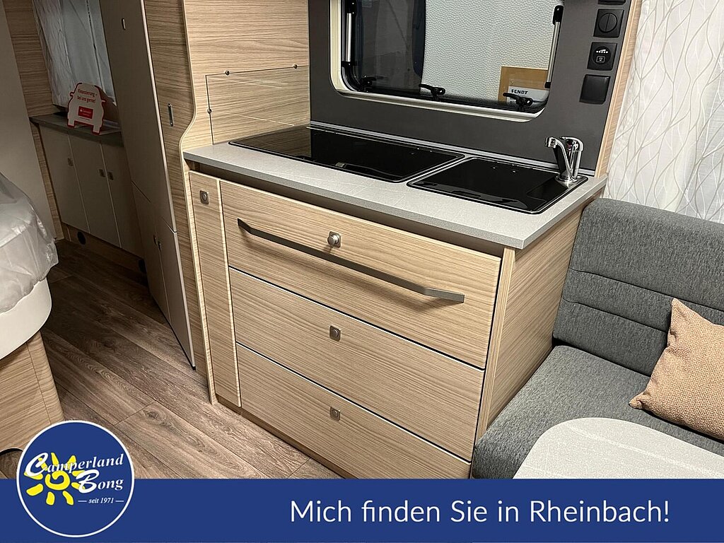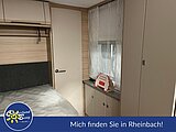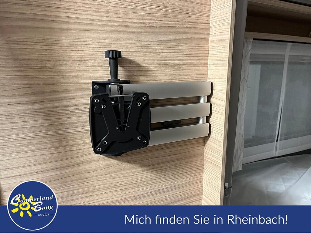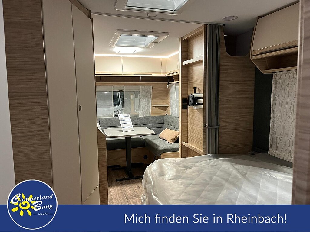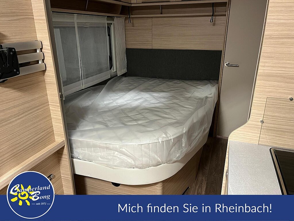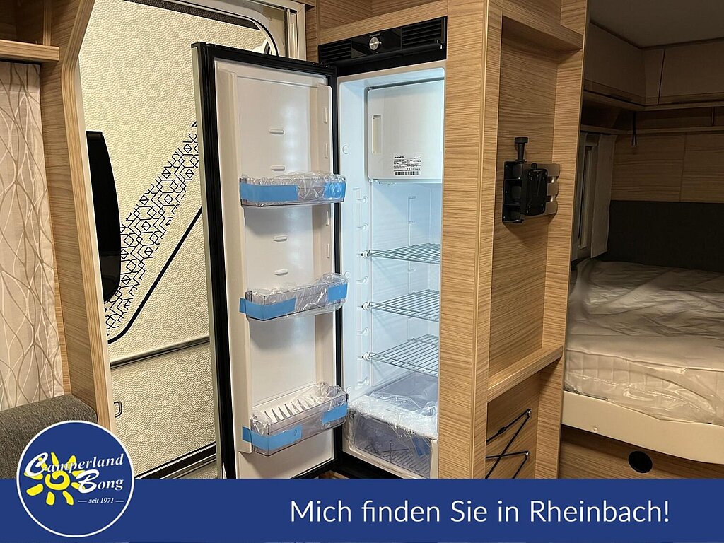 - Eingangstür mit integriertem und isoliertem Einstieg, Abfallsammler und Ablage, im oberen Eingangstürbereich getöntes Fenster und Verdunkelungsplissee