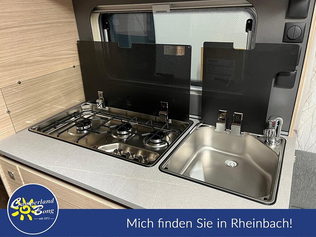 - Kocher (3-flammig) mit Zündsicherung, Zündautomatik, matt emailliertem Kocherrost, Glasabdeckung und separater Spüle mit Glasabdeckung