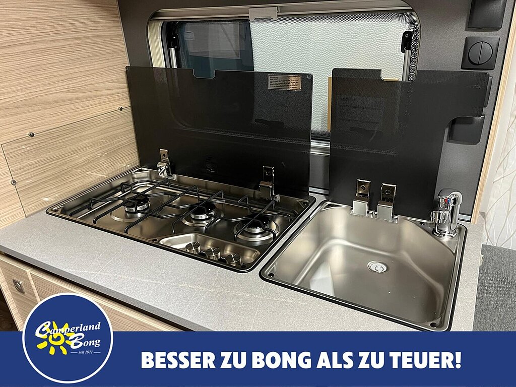 - Kocher (3-flammig) mit Zündsicherung, Zündautomatik, matt emailliertem Kocherrost, Glasabdeckung und separater Spüle mit Glasabdeckung