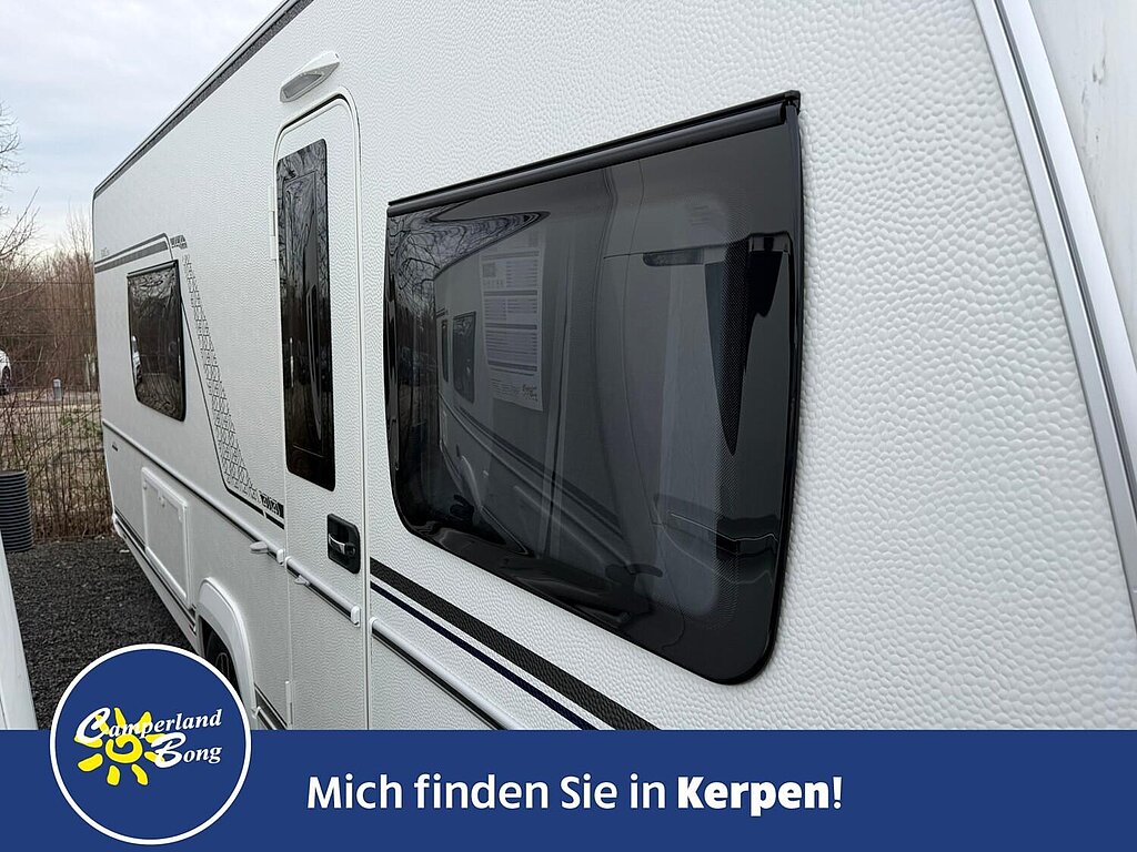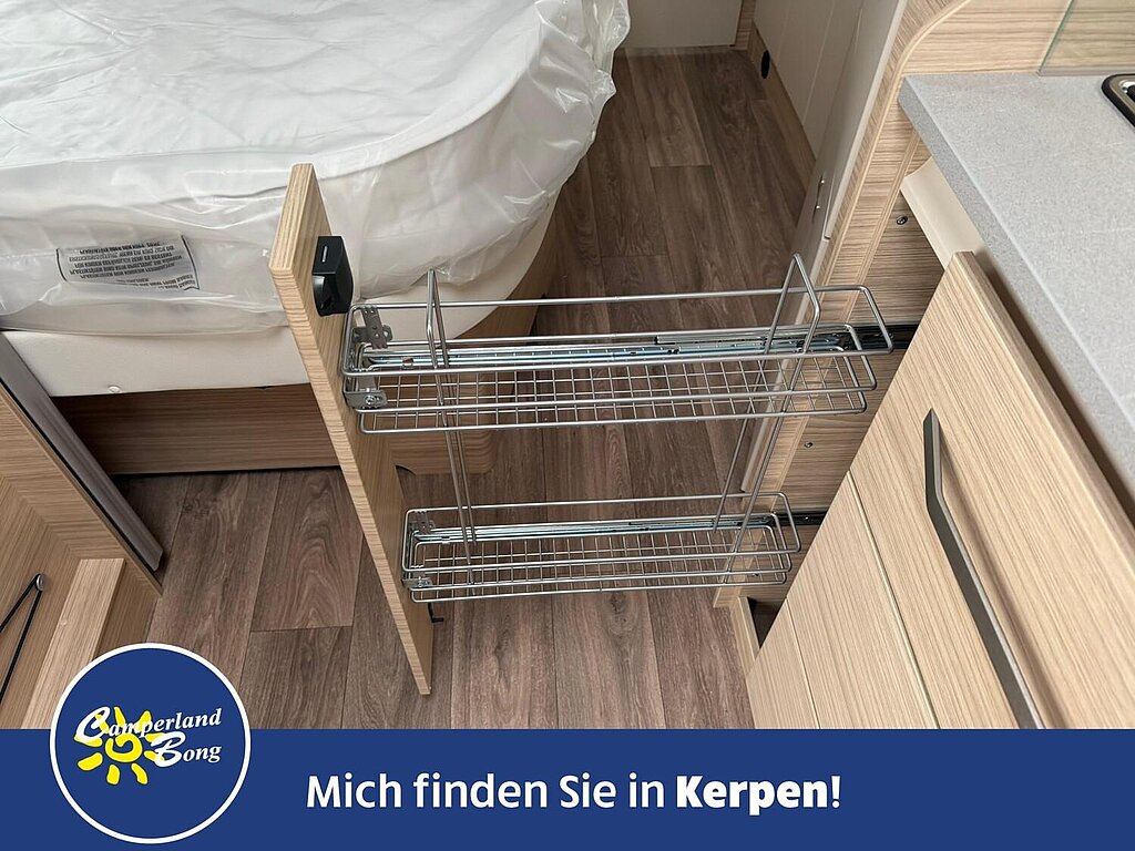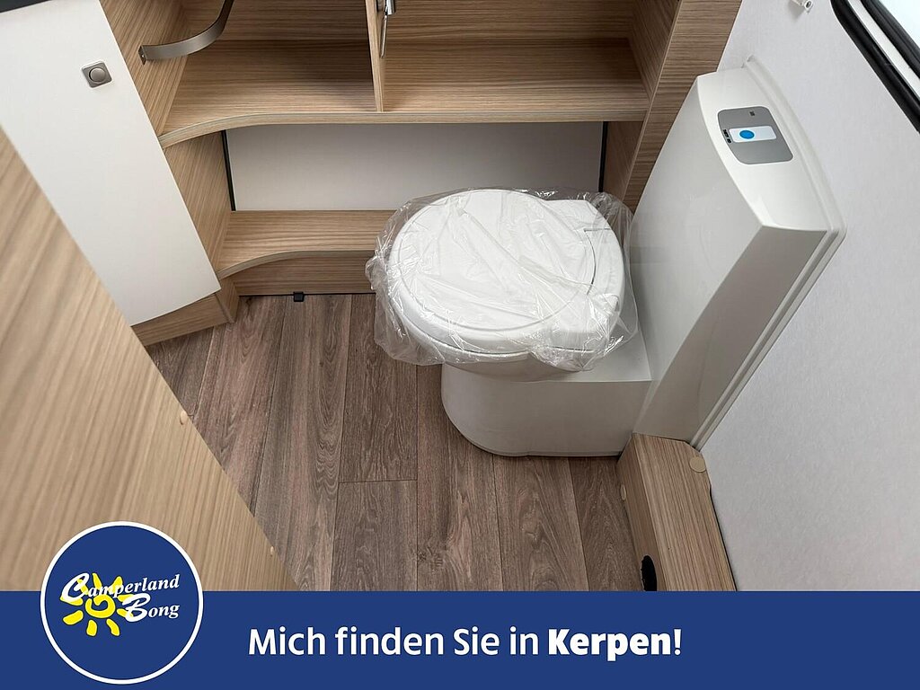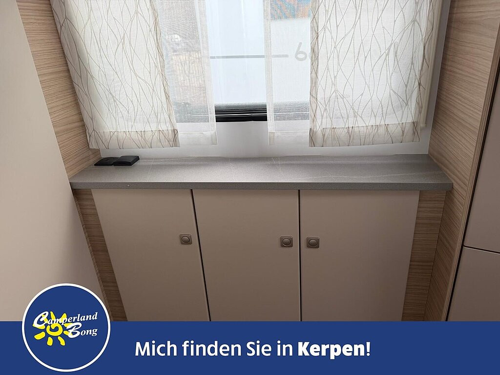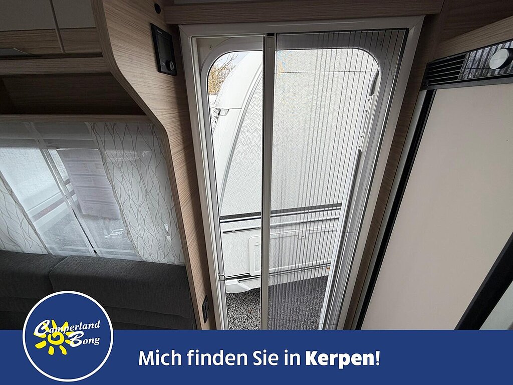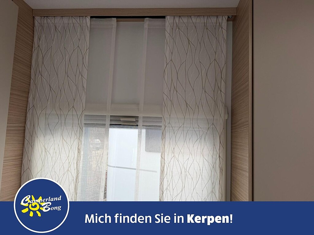 - Eingangstür mit integriertem und isoliertem Einstieg, Abfallsammler und Ablage, im oberen Eingangstürbereich getöntes Fenster und Verdunkelungsplissee