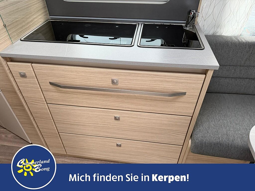 - Kocher (3-flammig) mit Zündsicherung, Zündautomatik, matt emailliertem Kocherrost, Glasabdeckung und separater Spüle mit Glasabdeckung