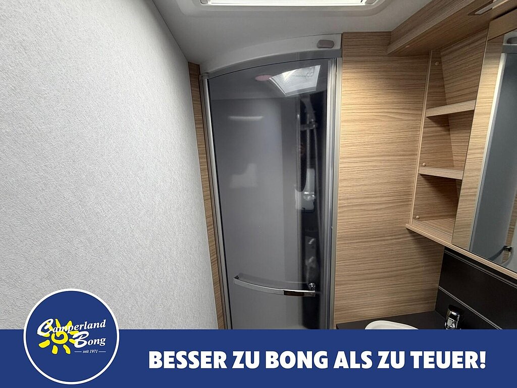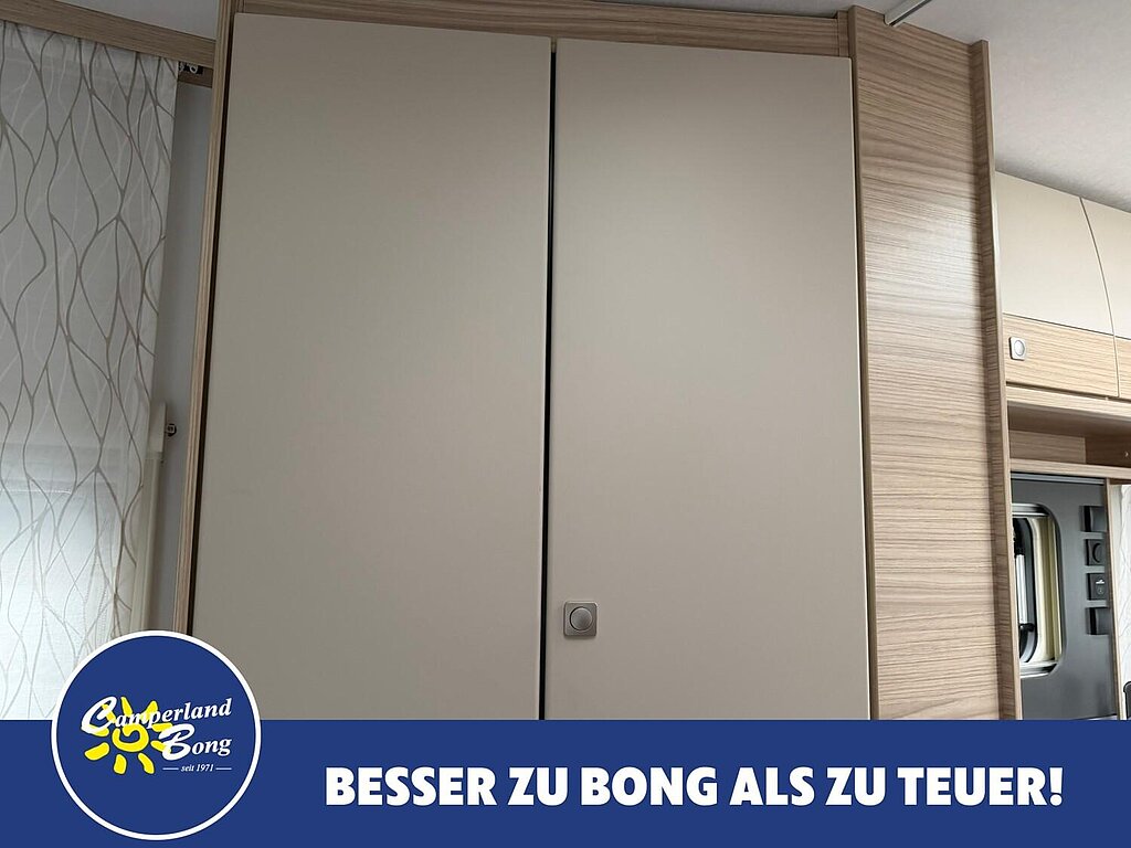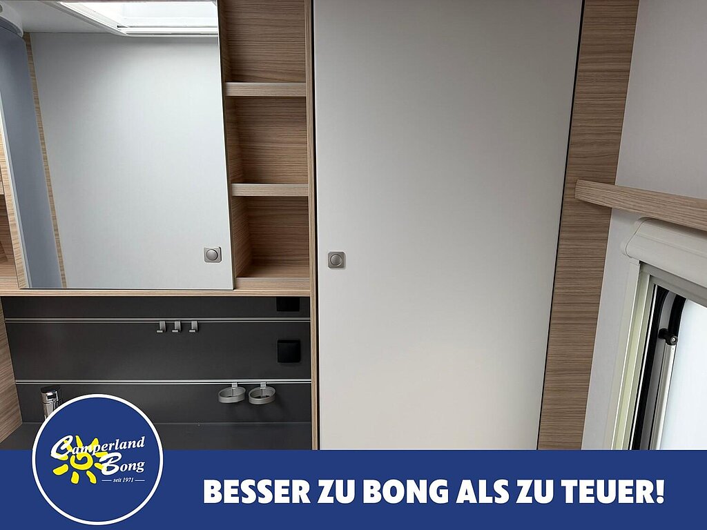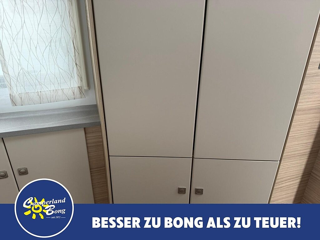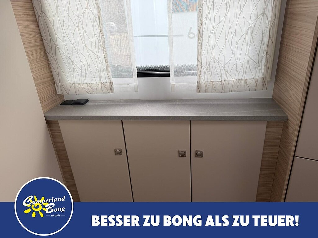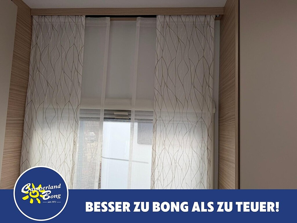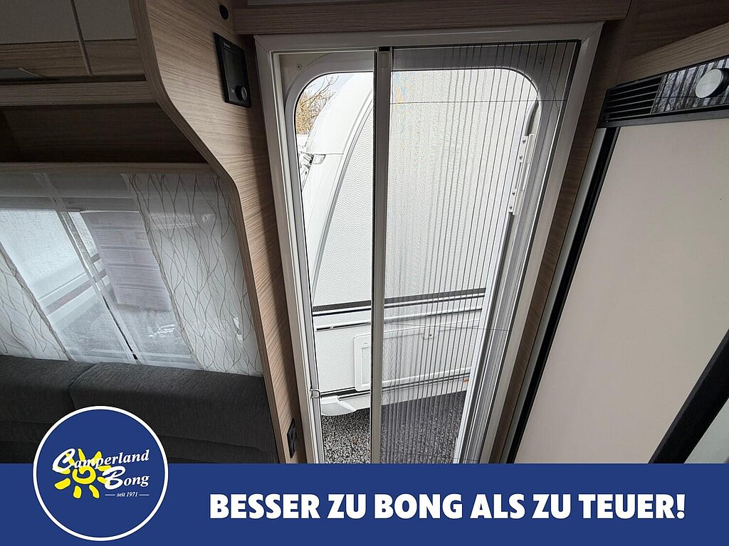 - Eingangstür mit integriertem und isoliertem Einstieg, Abfallsammler und Ablage, im oberen Eingangstürbereich getöntes Fenster und Verdunkelungsplissee