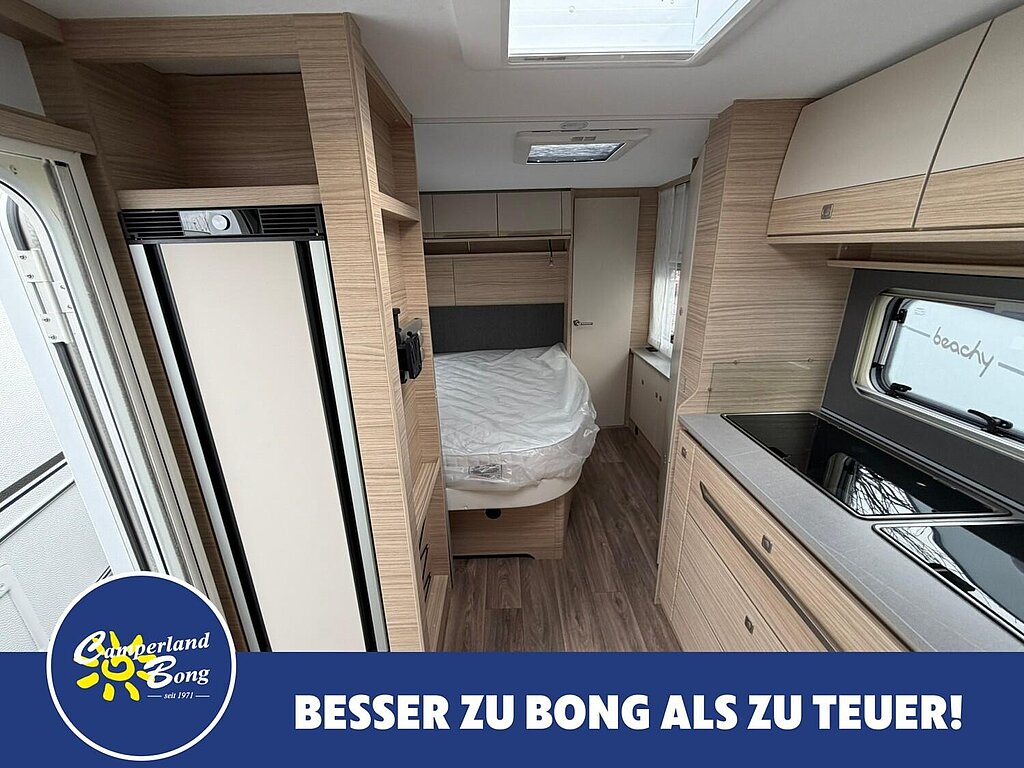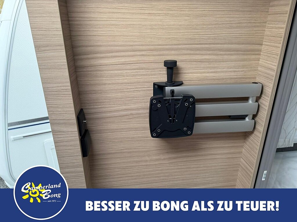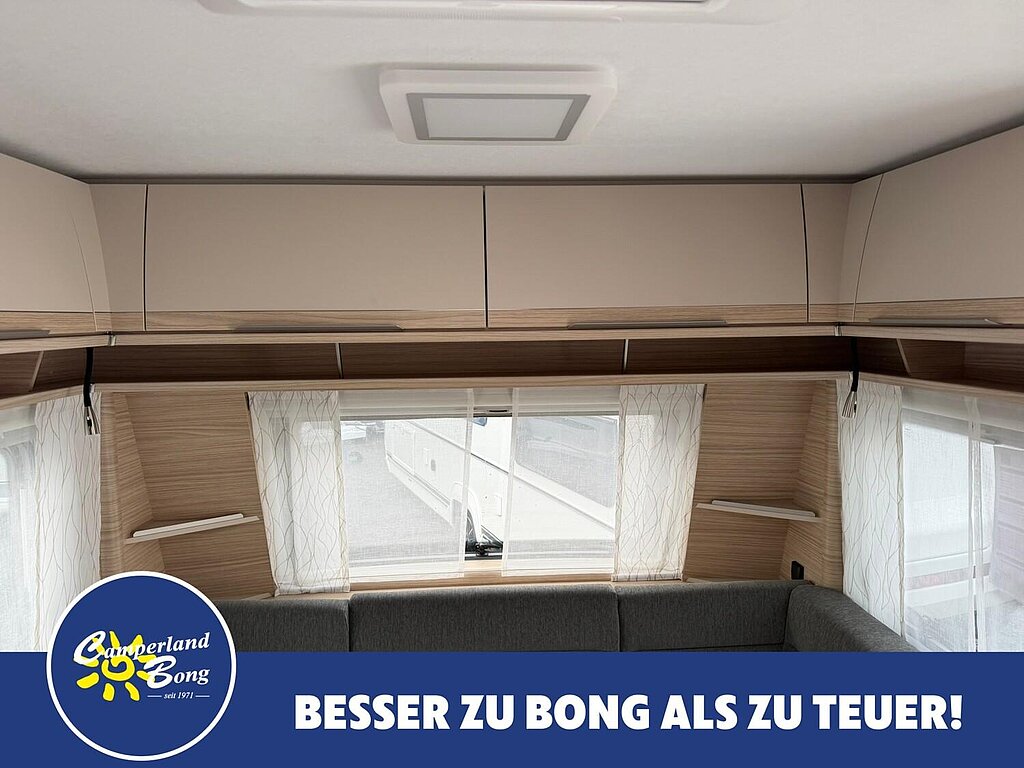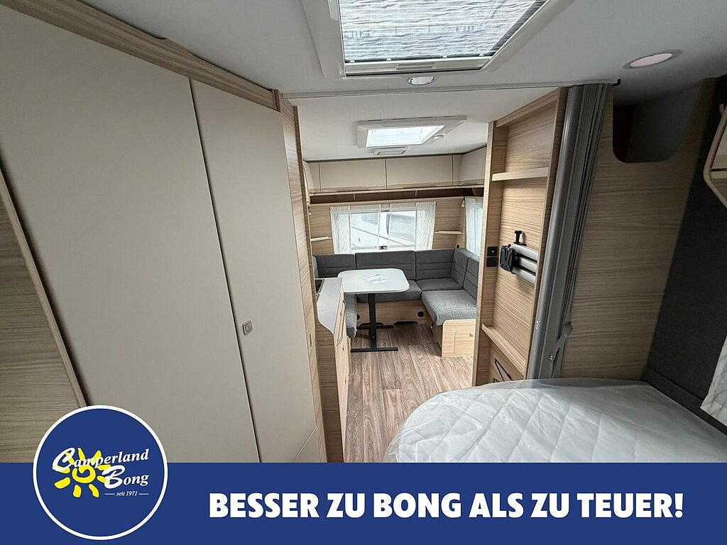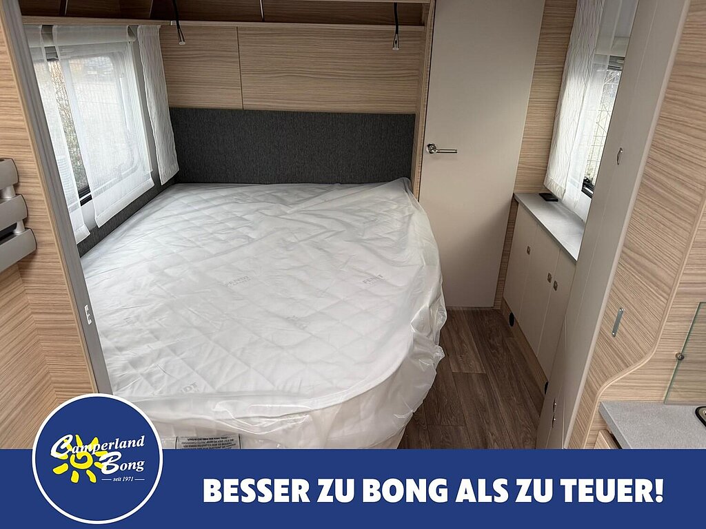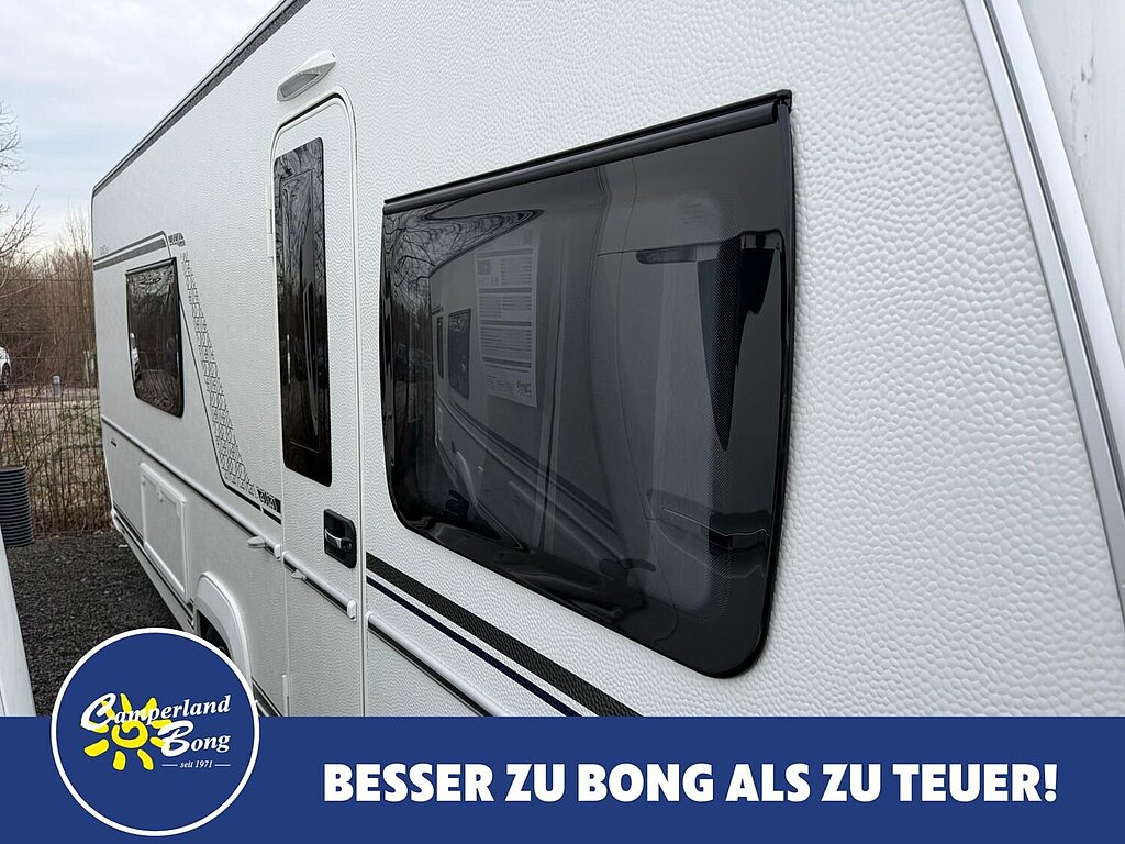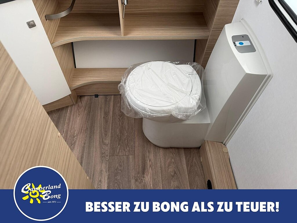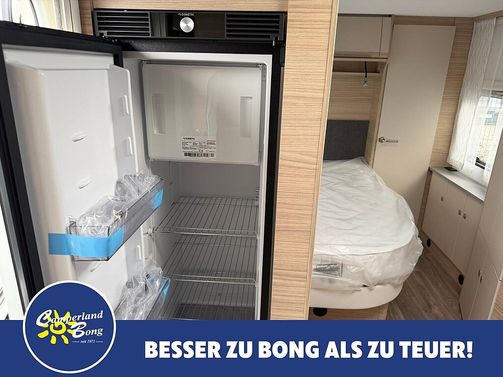 - Eingangstür mit integriertem und isoliertem Einstieg, Abfallsammler und Ablage, im oberen Eingangstürbereich getöntes Fenster und Verdunkelungsplissee