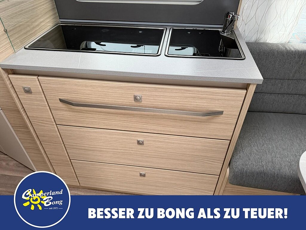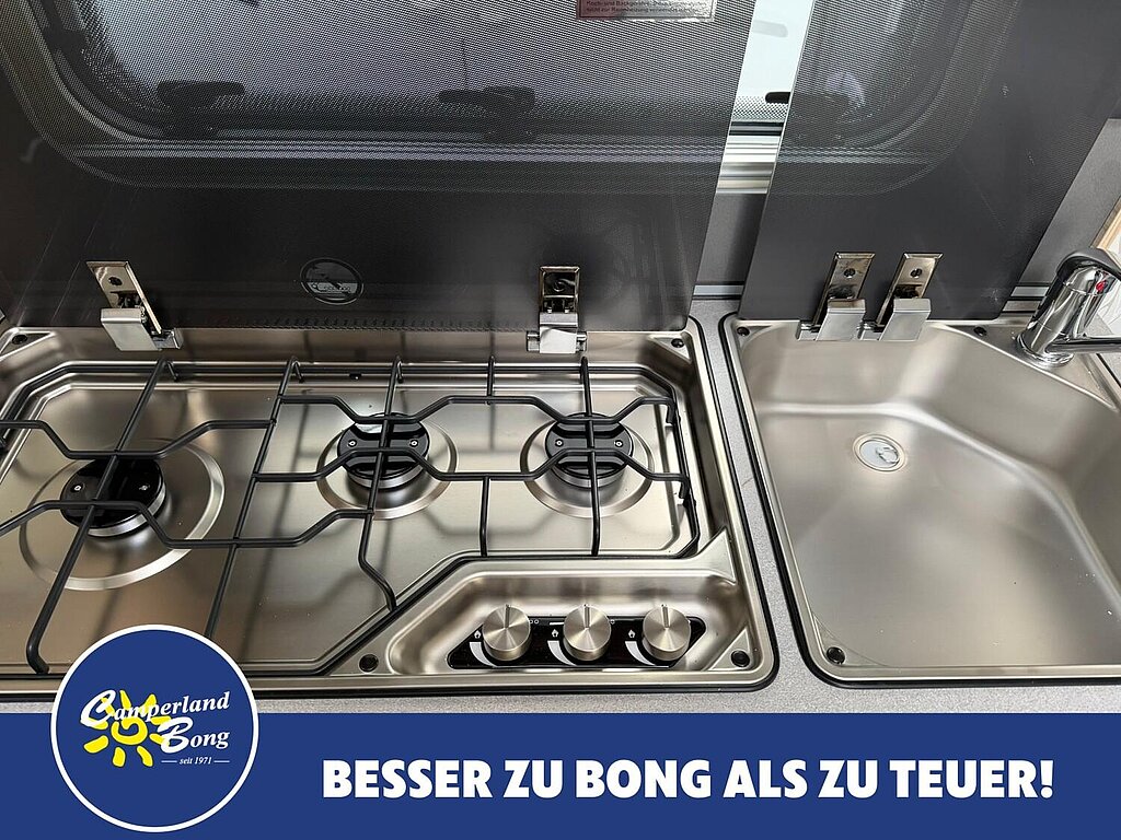 - Kocher (3-flammig) mit Zündsicherung, Zündautomatik, matt emailliertem Kocherrost, Glasabdeckung und separater Spüle mit Glasabdeckung