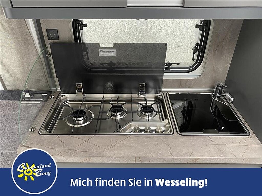 - Absorbertechnik, Kocher und Spüle aus Edelstahl, mit 3-Flammkocher, elektrischer Zündung und zweiteiliger Glasabdeckung