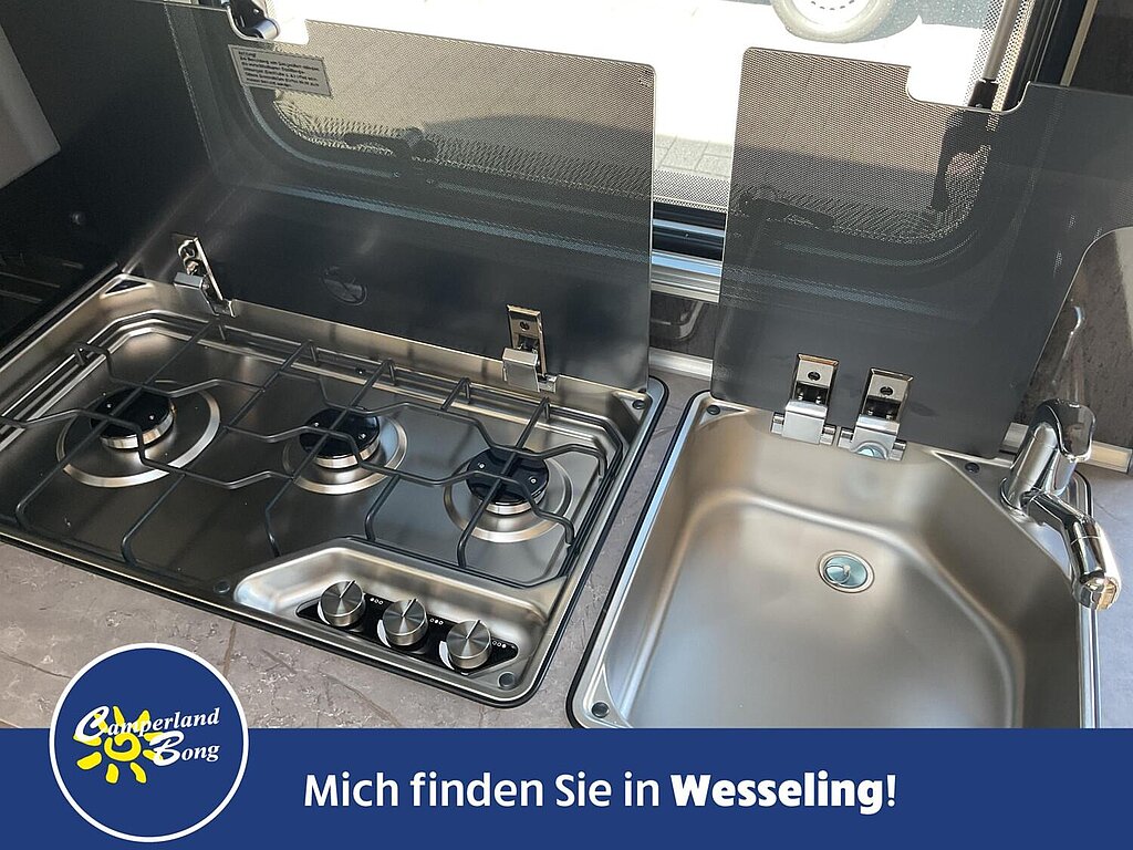 • Kocher und Spüle aus Edelstahl, mit 3-Flammkocher, elektrischer Zündung und zweiteiliger Glasabdeckung