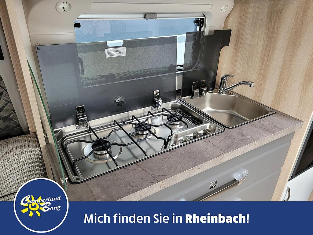 - Absorbertechnik, Kocher und Spüle aus Edelstahl, mit 3-Flammkocher, elektrischer Zündung und zweiteiliger Glasabdeckung