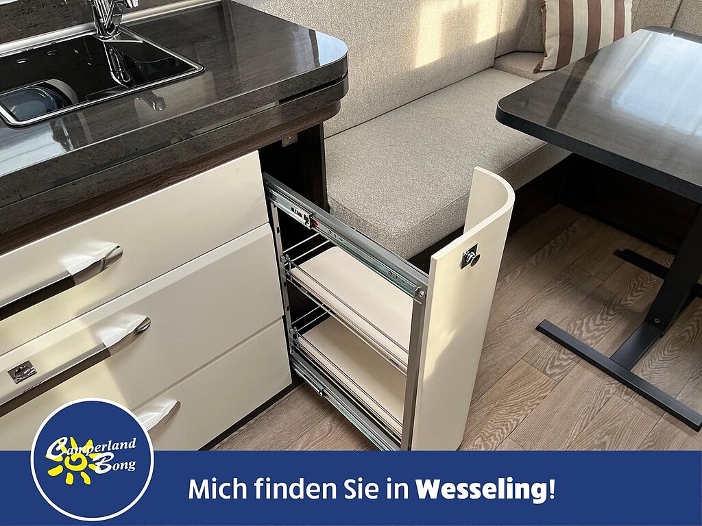 - Winterbelüftung für Sitzgruppe, Stauschränke und Betten, Eingangstür einteilig, extrabreit mit Dreifachverriegelung, Fenster, Abfalleimer