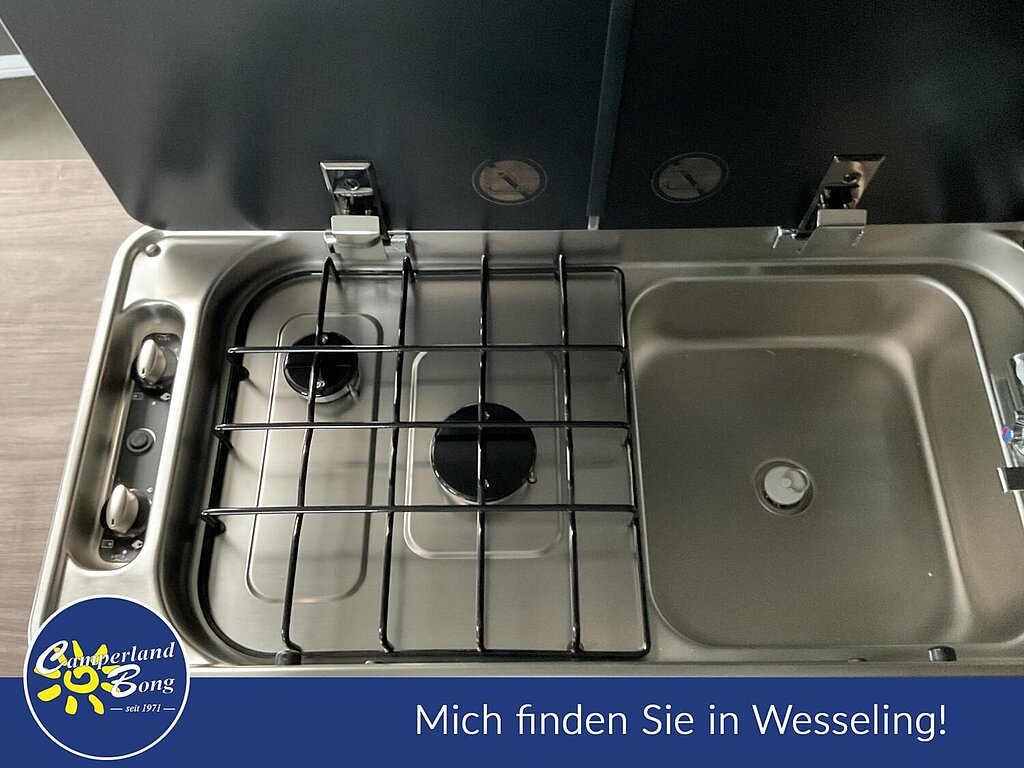 - Kocher-Spüle-Kombination aus Edelstahl mit 2-Flammkocher, elektrischer Zündung, versenkbarer Armatur und zweiteiliger Glasabdeckung