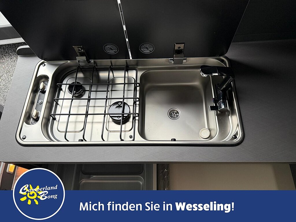 - Kocher-Spülen-Kombination inkl. 2-Flammen-Kocher mit elektrischer Brennerzündung und geteilter Glasabdeckung (Abhängigkeit: ABH28074)