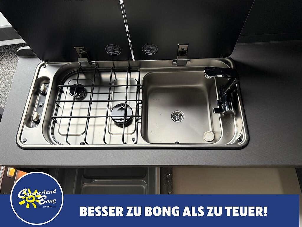 - Kocher-Spülen-Kombination inkl. 2-Flammen-Kocher mit elektrischer Brennerzündung und geteilter Glasabdeckung (Abhängigkeit: ABH28074)