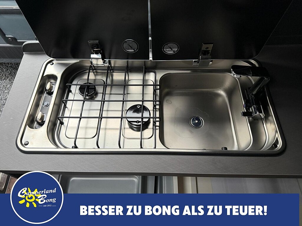 - Kocher-Spülen-Kombination inkl. 2-Flammen-Kocher mit elektrischer Brennerzündung und geteilter Glasabdeckung (Abhängigkeit: ABH28074)