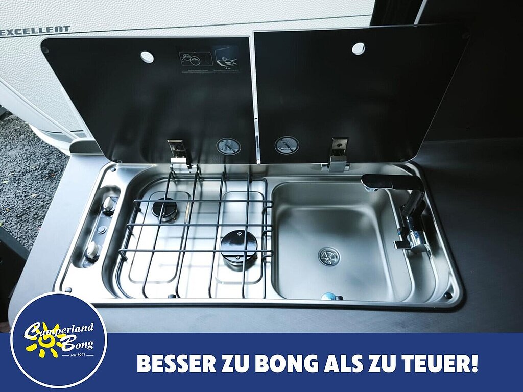 - Kocher-Spülen-Kombination inkl. 2-Flammen-Kocher mit elektrischer Brennerzündung und geteilter Glasabdeckung (Abhängigkeit: ABH28074)