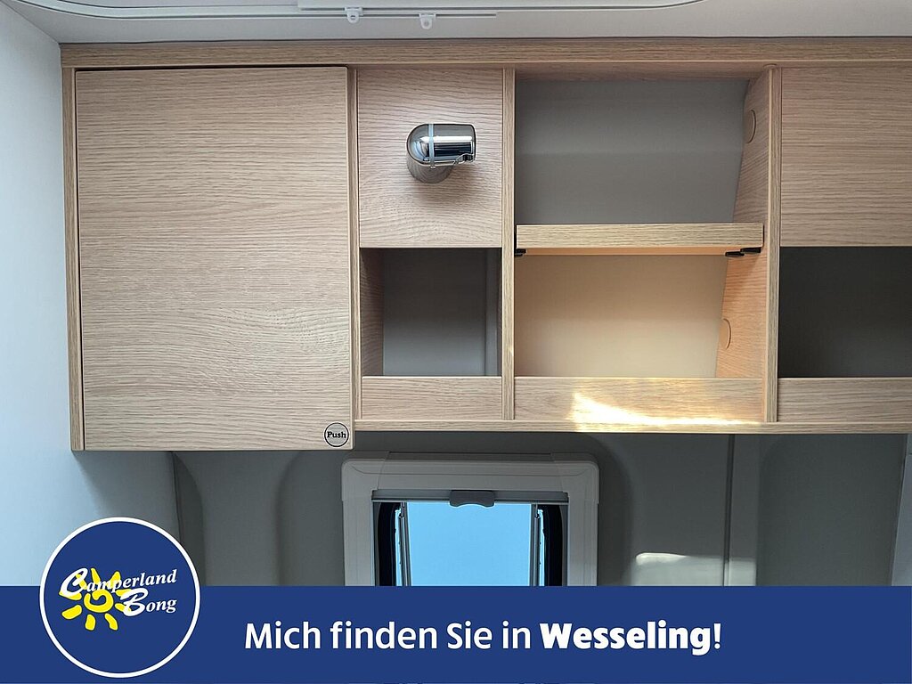 - Basic Paket (Panoramadachhaube 70 x 50 cm, Duschausstattung, Fenster im Bad, Kleiderstange in der Nasszelle, Breite Einstiegsstufe, Drehplatte für Tischerweiterung an der Sitzgruppe)