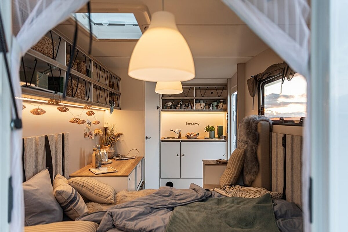 Natürliche Materialien und helle Farben holen das Strandgefühl hinein, und mit wenigen Handgriffen verlegen Sie Ihren Ess-, Sitz- oder Schlafbereich einfach nach draußen. Viel Stauraum, gemütliche Schlafplätze und eine praktische Küche sind selbstverständlich inklusive.